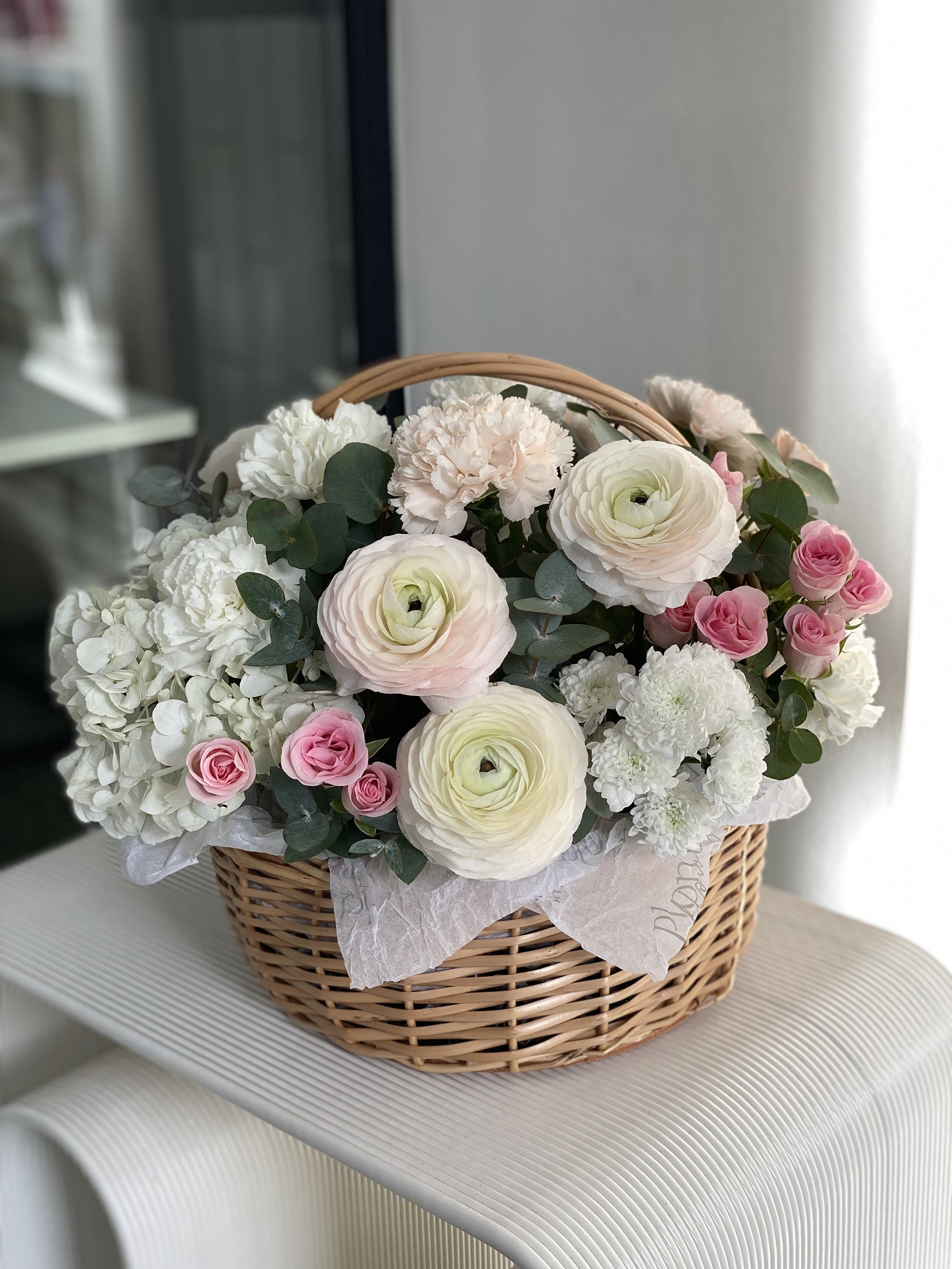 Charming elegance blooms in a rustic woven basket filled with white ranunculus, blush carnations, pink spray roses, and fresh eucalyptus. Featuring ivory ranunculus, white hydrangeas, pale pink carnations, white chrysanthemums, pink spray roses, and eucalyptus greenery, this romantic arrangement creates a cottage-inspired aesthetic. Perfect for celebrations, intimate gatherings, or as a thoughtful gift that conveys natural beauty and grace.