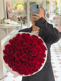 A grand, luxurious arrangement of fifty long-stem red roses designed to make a powerful impression. Each stem is selected for its size, deep crimson color, and perfectly opened bloom. This bouquet is a classic statement of love — bold, elegant and unmistakably romantic.